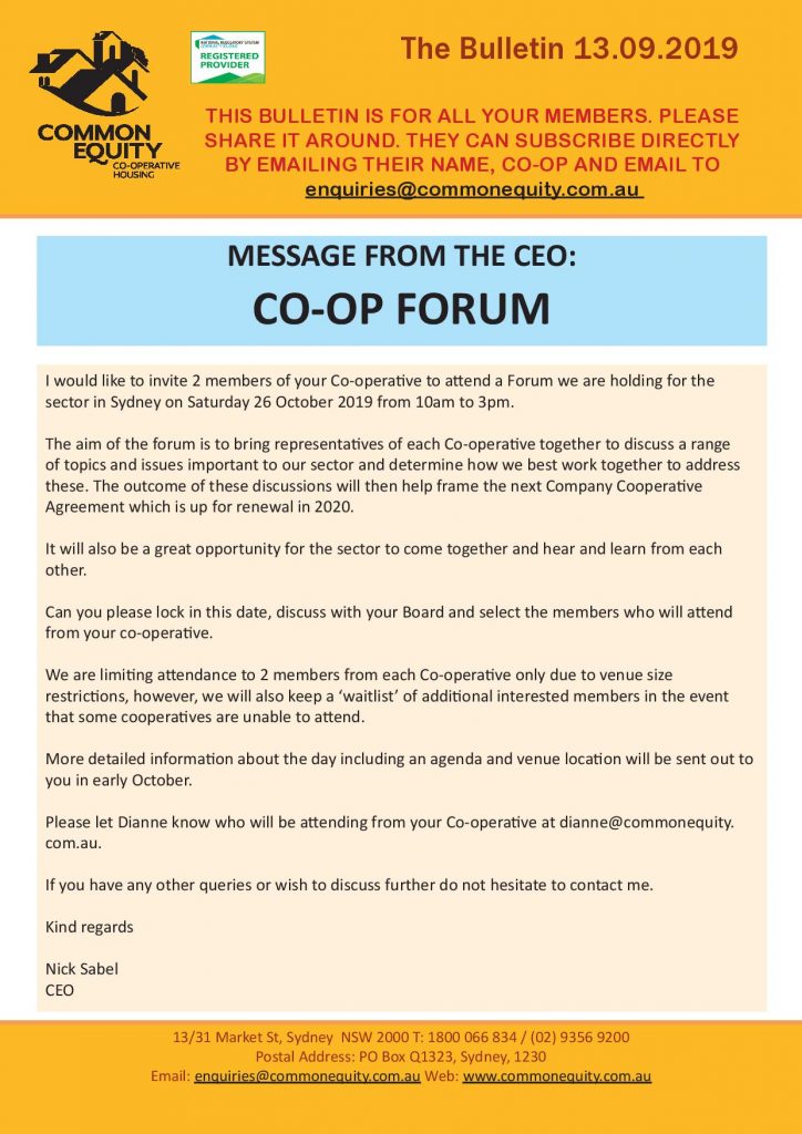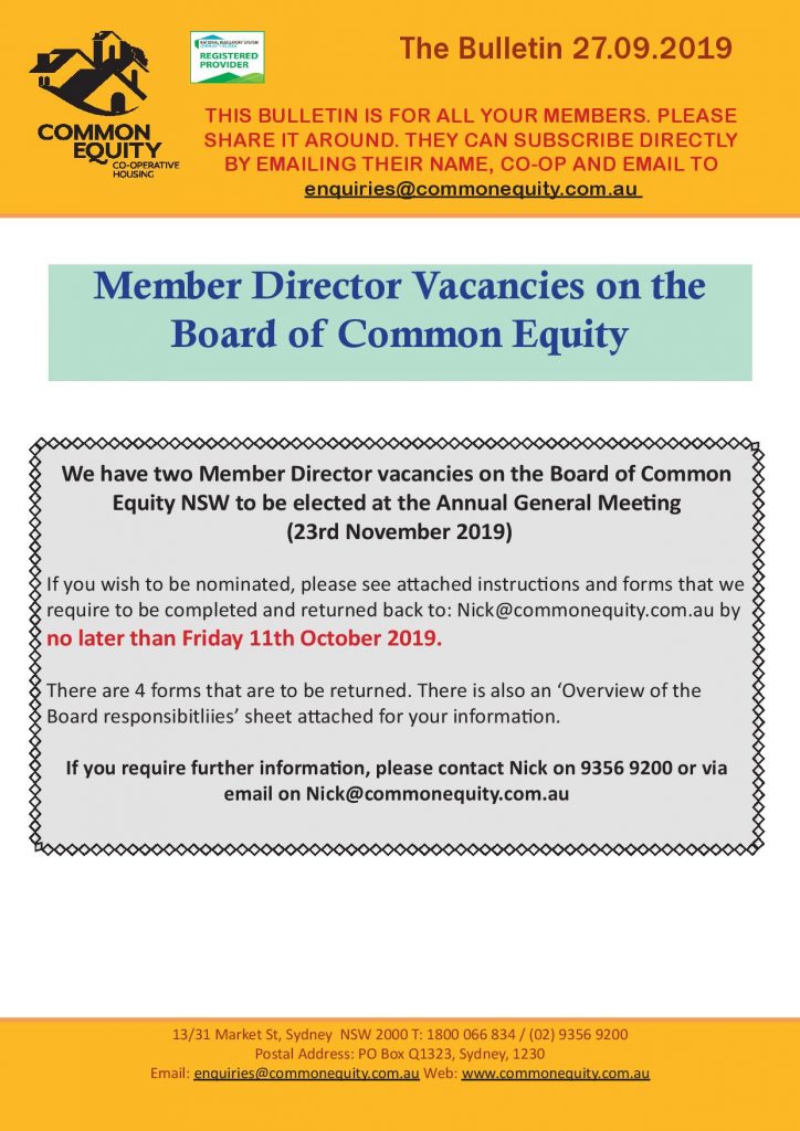In this issue: 27.09.19 – Member Director vacancies on the Board of Common Equity and application forms – CENSW AGM Information – Award Nominations 2019 – Co-op Forum – Has your Co-op RSVP’d? – additional CENSW Staff email address Read Now…